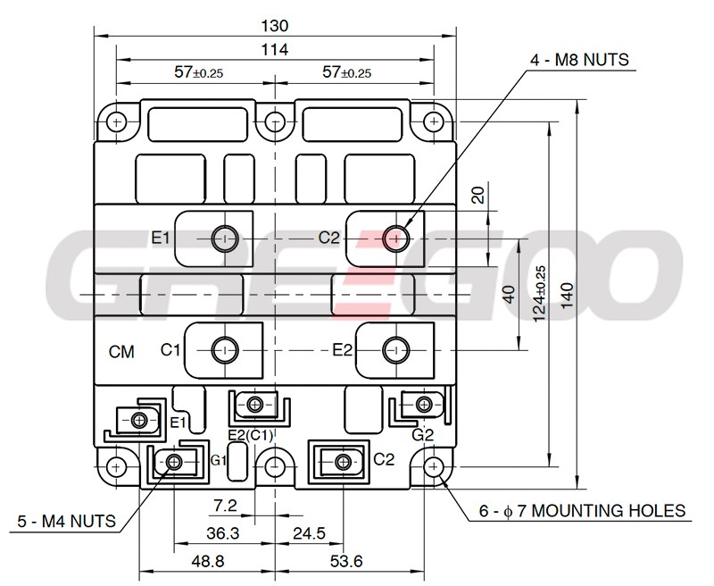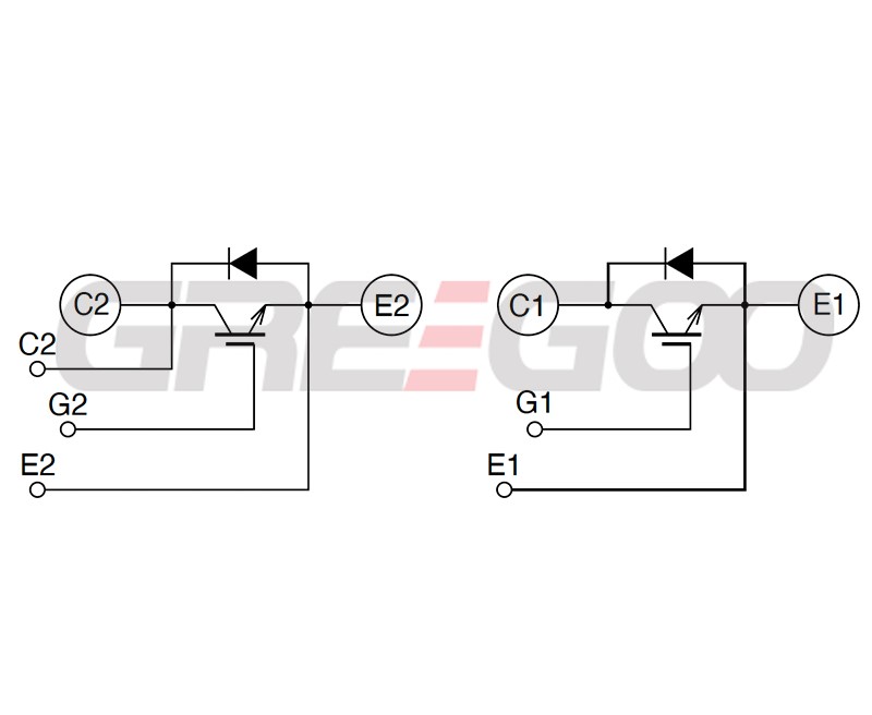 Configuration: Dual IGBT (two elements in a half-bridge pack) with built-in freewheeling diodes.