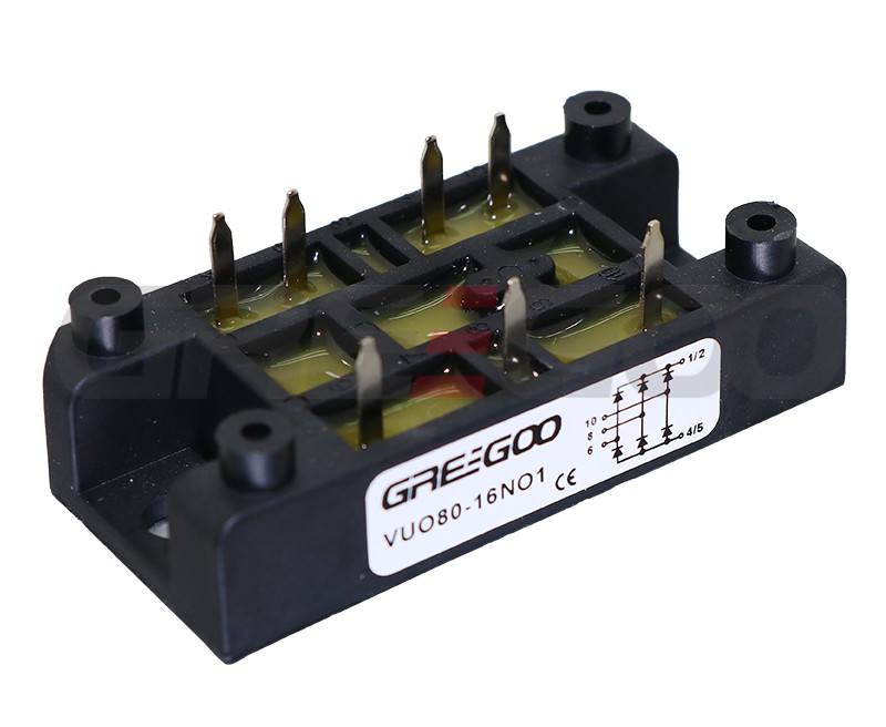 The VUO34, VUO52 and VUO80 are standard three-phase bridge rectifier module consist of six diodes arranged in a bridge configuration to convert three-phase alternating current (AC) to direct current (DC). These modules are commonly used in industrial power electronics for efficient and reliable rectification, with a focus on high isolation and thermal performance.